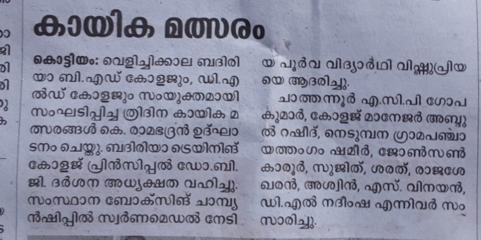 College sports day was conducted by Department of Physical Education from 27/05/2022 to 31/05/2022. the sports celebration was named as "CELERITAS" and theme was "Sports for Health". The word "Celeritas" has its origin in Latin language which means "Quickness". The event inauguration was done by Sri. Jibin Sebastin (National Volley Ball Player).